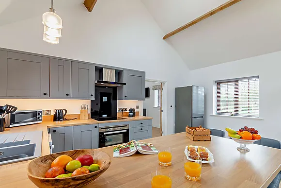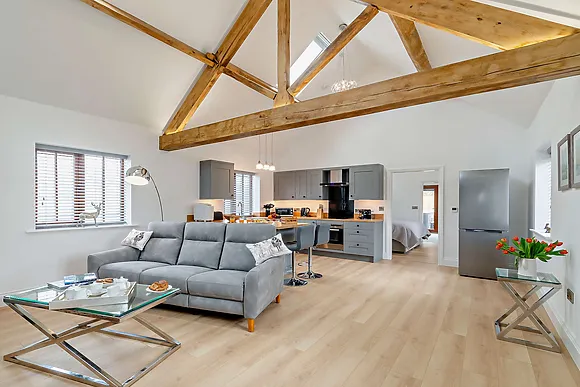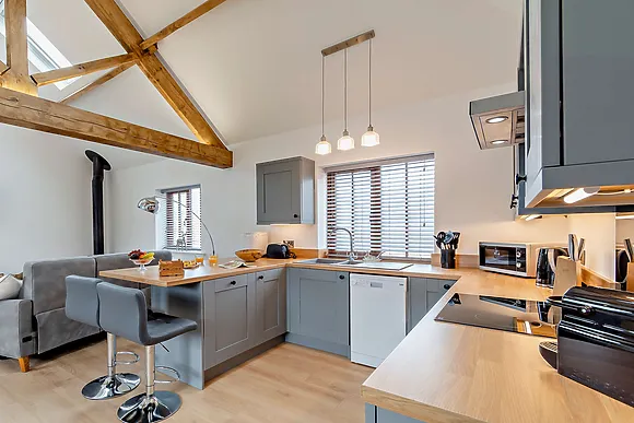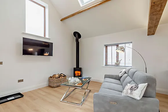 The open-plan living space exudes charm with exposed wooden beams, a wood burner, and a modern kitchen equipped with all the necessities, including a Nespresso coffee machine.