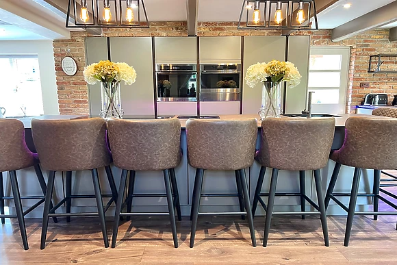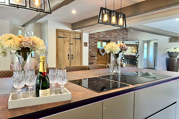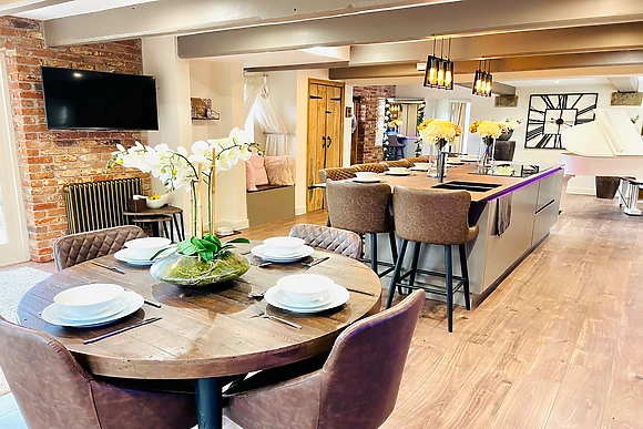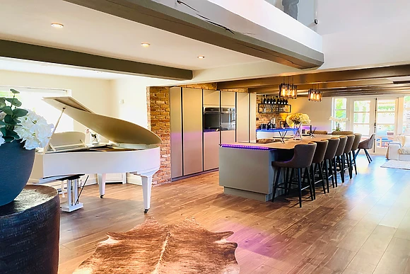 Indulge in the opulence of the cottage's interior, featuring an open-plan living space with a grand piano and plush sofas, alongside a sleek kitchen equipped with modern amenities.