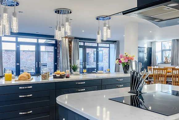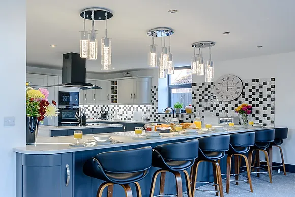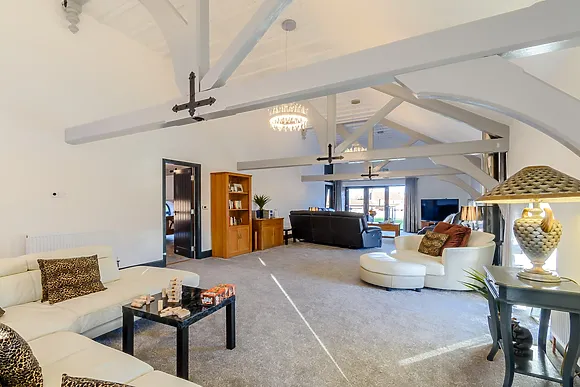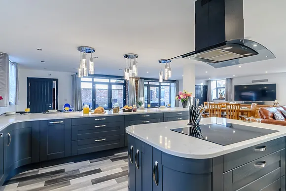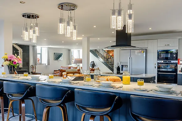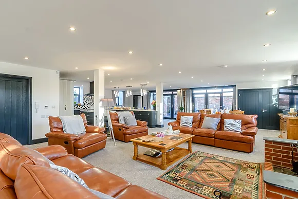 Inside, the open-plan lounge/kitchen/diner, adorned with high-end furnishings, is perfect for family gatherings.