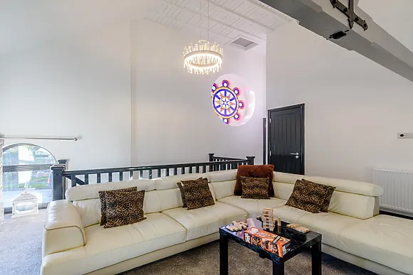 Discover the enchanting blend of history and luxury at the former Methodist Chapel, now a stunning holiday retreat that sleeps 10. The Old St Johns Church, with its Romanesque-style exterior, invites you into a world where original features like the stained glass window meet contemporary comforts.