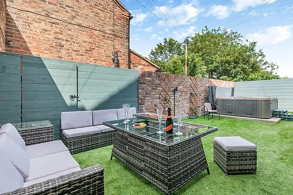 Yes, the property features an 8-seater hot tub in the enclosed garden patio area, perfect for guests to unwind and enjoy some relaxation time.