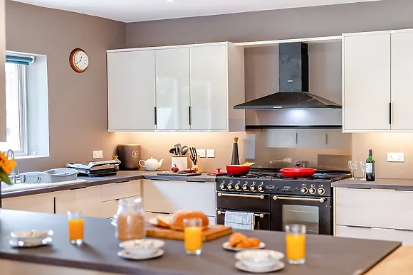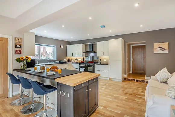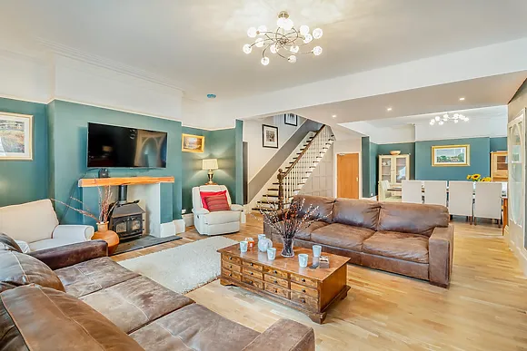 Indulge in the warmth of the wood burner in the open-plan living area, or gather around the impressive dining table for a family meal. The kitchen is equipped with a range oven and a breakfast bar, ideal for social cooking or casual dining.