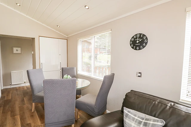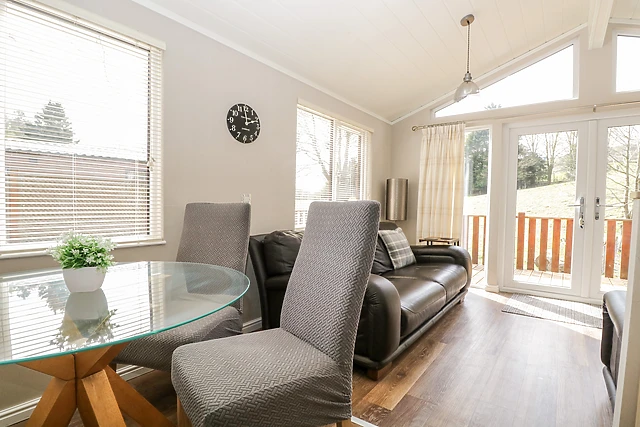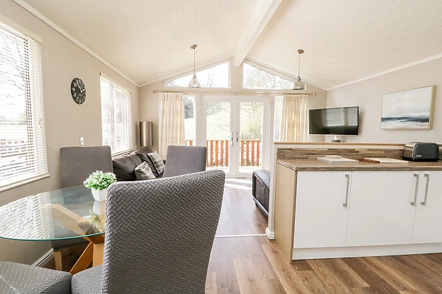 With space to comfortably sleep four guests, this all-ground-floor lodge boasts two inviting bedrooms, including a king-size with an en-suite and a twin room. The open-plan living space, complete with a smart TV and plush leather sofas, offers a cosy haven for relaxation.