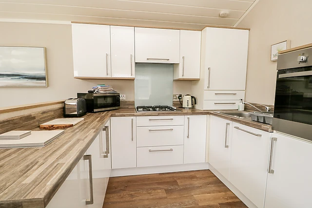 The lodge boasts a fully equipped kitchen with a gas hob, electric oven, fridge/freezer, microwave, dishwasher, and a slow cooker, making it easy to prepare meals during your stay.