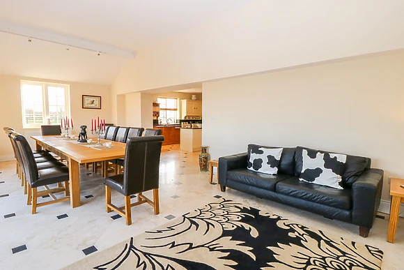 There is a dining area with seating for up to 18 people, making for a wonderful social space for the whole family to dine together. All nine bedrooms have a range of modern furnishings, which complement the light decor, and offer an abundance of space to store your personal items, with three of the bedrooms located in the annex, 20 yards from the main property.