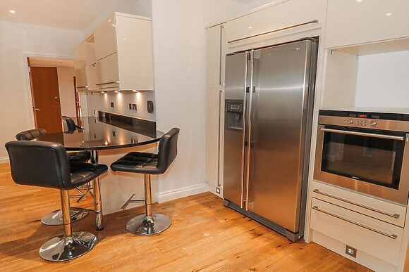 Next, the kitchen presents itself with sleek granite worktops, modern, integrated fixtures and contemporary colourways. The living room comprises a lovely set of patchwork sofas, a toasty gas fire on the wall, and adjoins the TV room, which boasts French doors leading to the outdoor space.