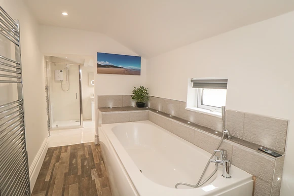 Step outside to discover a private garden, complete with seating for alfresco dining. The highlight, however, is the luxurious hot tub, inviting you to unwind under the stars after a day of exploration.
